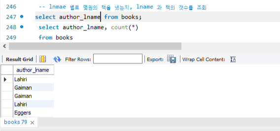 select author_lname, count(*) from books group by author_lname; (248~250번)의 의미는
