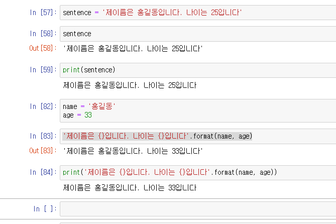 의 결과는, "제 이름은 홍길동 입니다. 나이는 33 살입니다." 이렇게 된다.