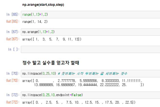 아래 그림과 같이 np.arnage(시작숫자,끝 숫자 , 넘기고싶은 숫자)를 사용하면 된다.