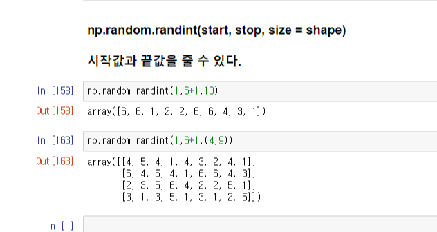 np.random.ranint(시작 숫자,끝 숫자, 원하는 갯수) 이며