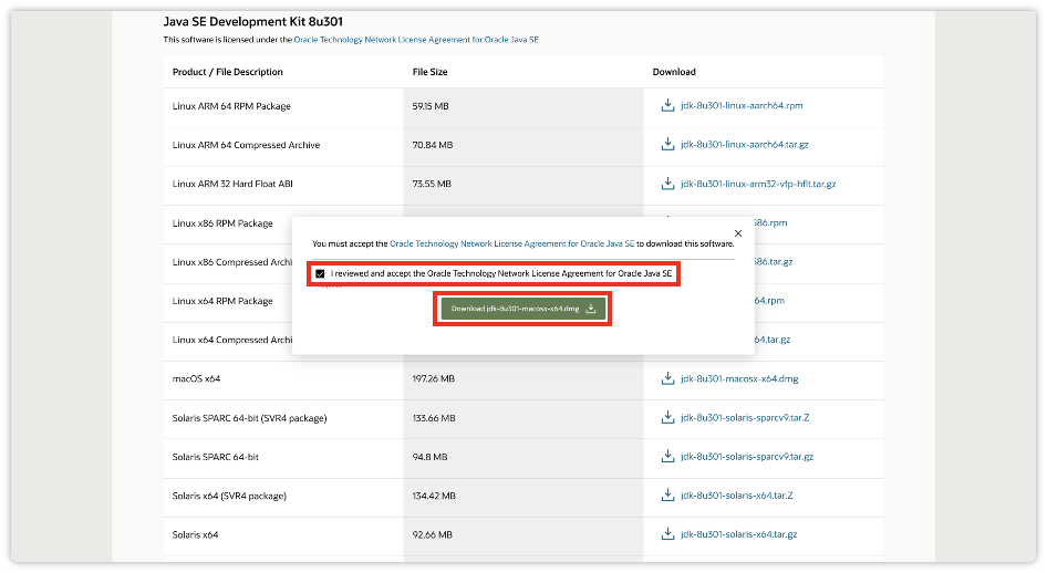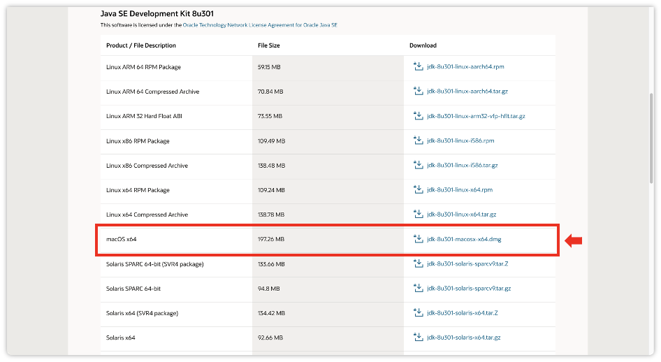 Oracle의 JDK 설치 목록 중에서 macOS의 dmg 파일을 선택합니다.