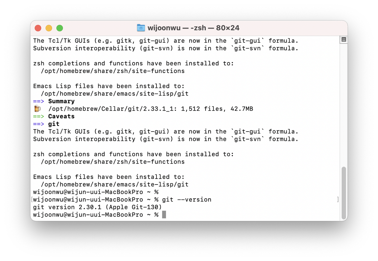 git 버전이 출력되면 정상적으로 설치됐음을 확인할 수 있습니다.