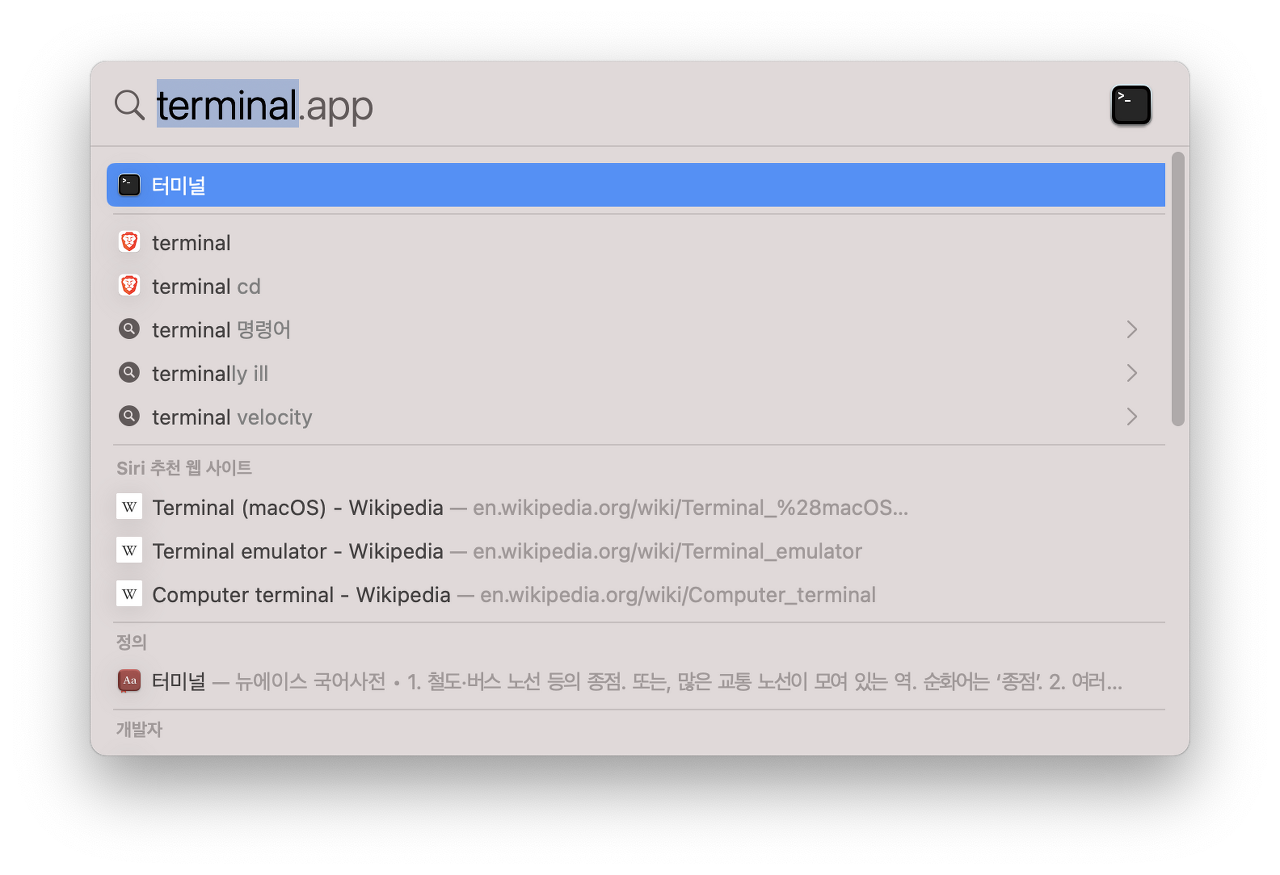 command + space 키를 눌러 터미널을 검색하고 실행 합니다.