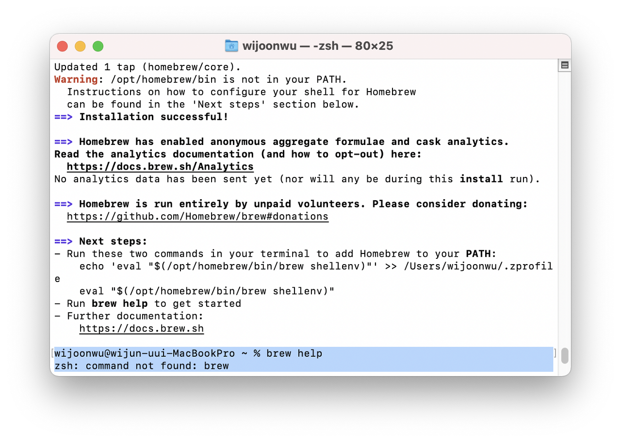 설치가 완료된 후 brew help 명령어를 통해 잘 설치가 됐는지 확인 합니다.