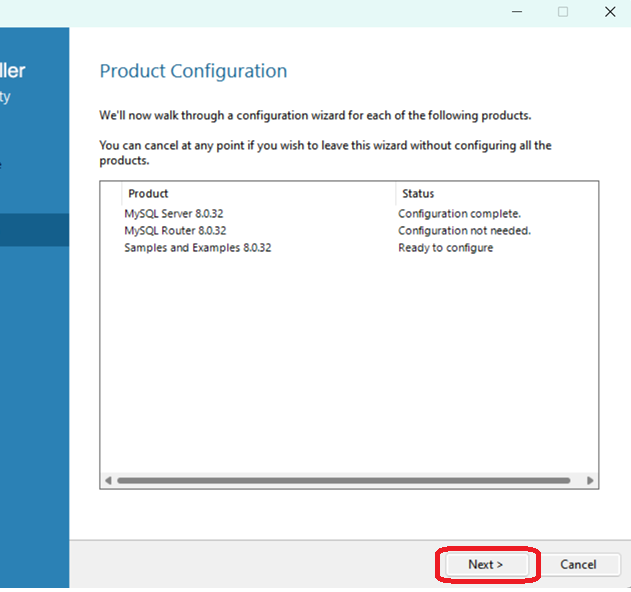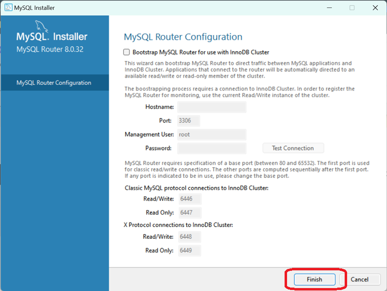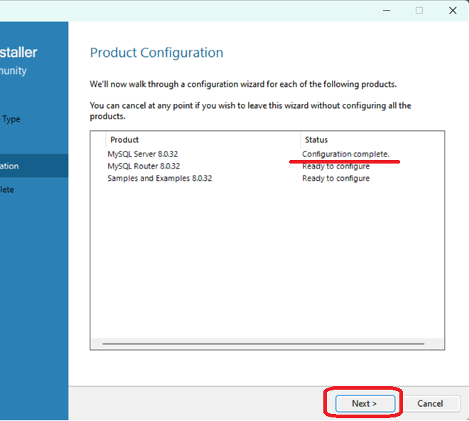 Finish를 클릭하면 MySQL Router의 환경설정이 완료됩니다.. 마지막 프로덕트의 환경설정을 위해 Next를 클릭합니다.