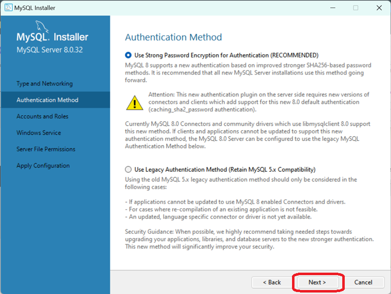 지금은 레거시가 된 MySQL의 구버전을 사용해야 한다면 Use Legacy Authentication Method 옵션을 선택합니다. 그렇지 않다면 바로 Next를 클릭합니다.
