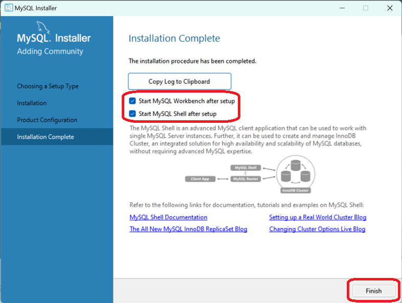 설치가 성공적으로 끝났습니다. Finish를 클릭하면 MySQL Workbench와 MySQL Shell이 실행됩니다.
