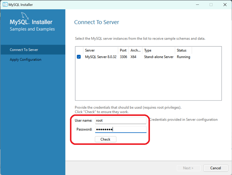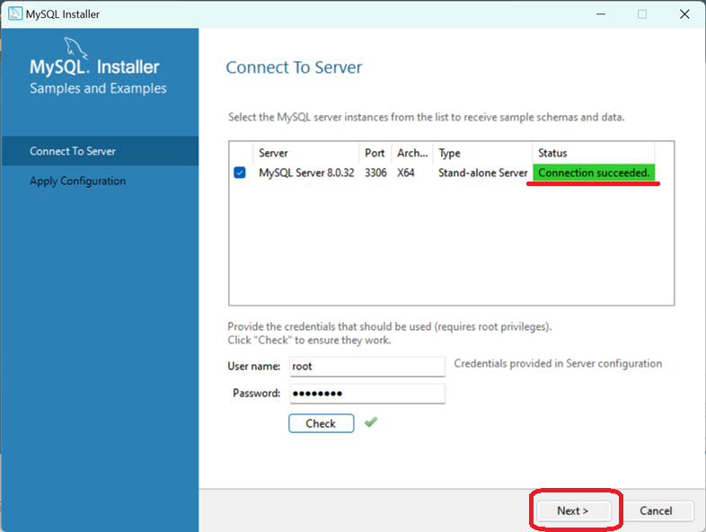 Password에 아까 전에 설정한 Root 계정의 비밀번호를 입력하고 Check를 클릭합니다. 체크가 완료되면 자동으로 서버에 연결을 시도하고 위와 같이 Connection succeeeded가 나타납니다. Next를 클릭합니다.