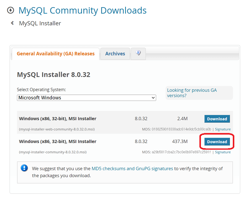https://dev.mysql.com/downloads/installer/를 방문하여 아래쪽에 위치한 mysql-installer-community를 눌러주세요. 용량이 큰데 이는 설치할 수 있는 파일들이 모두 포함돼 있기 떄문입니다, 팀원들과 버전을 맞추는데 편리하다는 장점이 있습니다. 위에 있는 'mysql-installer-web-community'는 용량이 낮으며 설치 중에 필요한 파일이 다운로드됩니다.