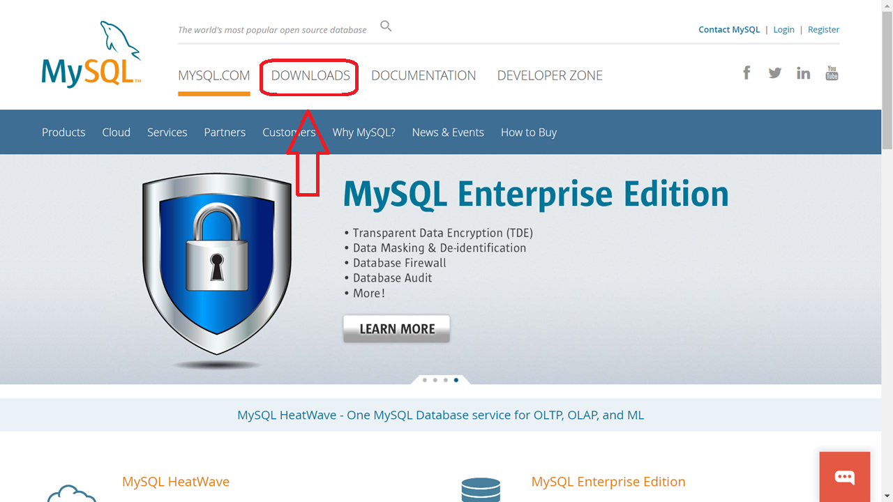 https://www.mysql.com/에 들어가서 메뉴바의 DOWNLOADS를 클릭합니다.