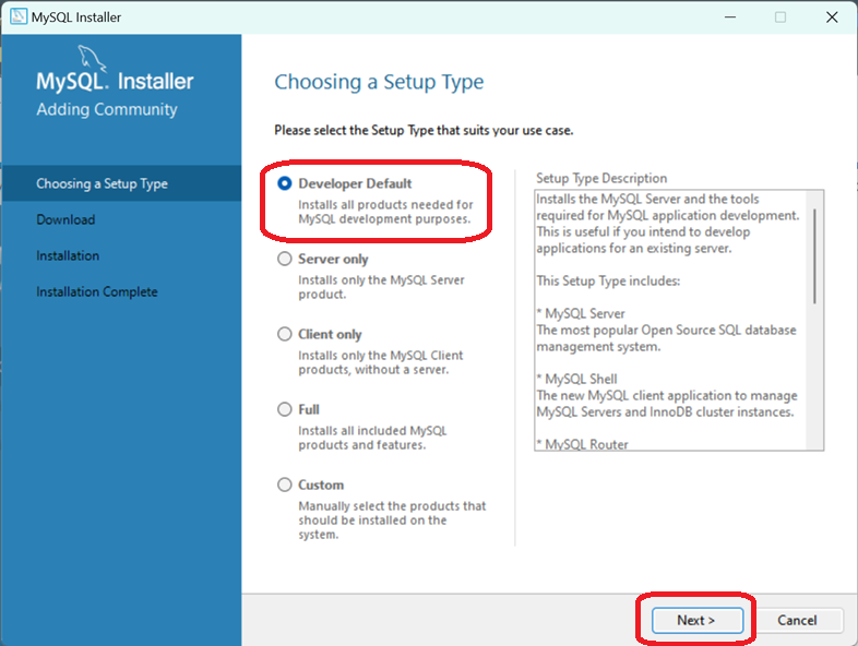 다운로드 받은 설치 파일을 실행하면 가장 먼저 나타나는 화면입니다. Next를 누릅니다. Developer Default옵션은 모든 MySQL 프로덕트를 설치할 수 있도록 해줍니다. 만약 특정 프로덕트만 설치하고 싶으시다면 다른 옵션들을 선택해주세요.