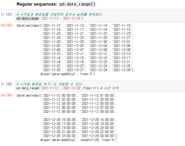 pd.date_range( '시작 일' , '종료 일' , freq='step(주기) ' ) 를 넣어주면 step에 맞춘 값을 알 수 있다.