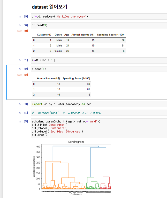 위에 그림은 파일을 불러온 뒤 덴드로그램까지의 코드를 적어놓은 것 이다.